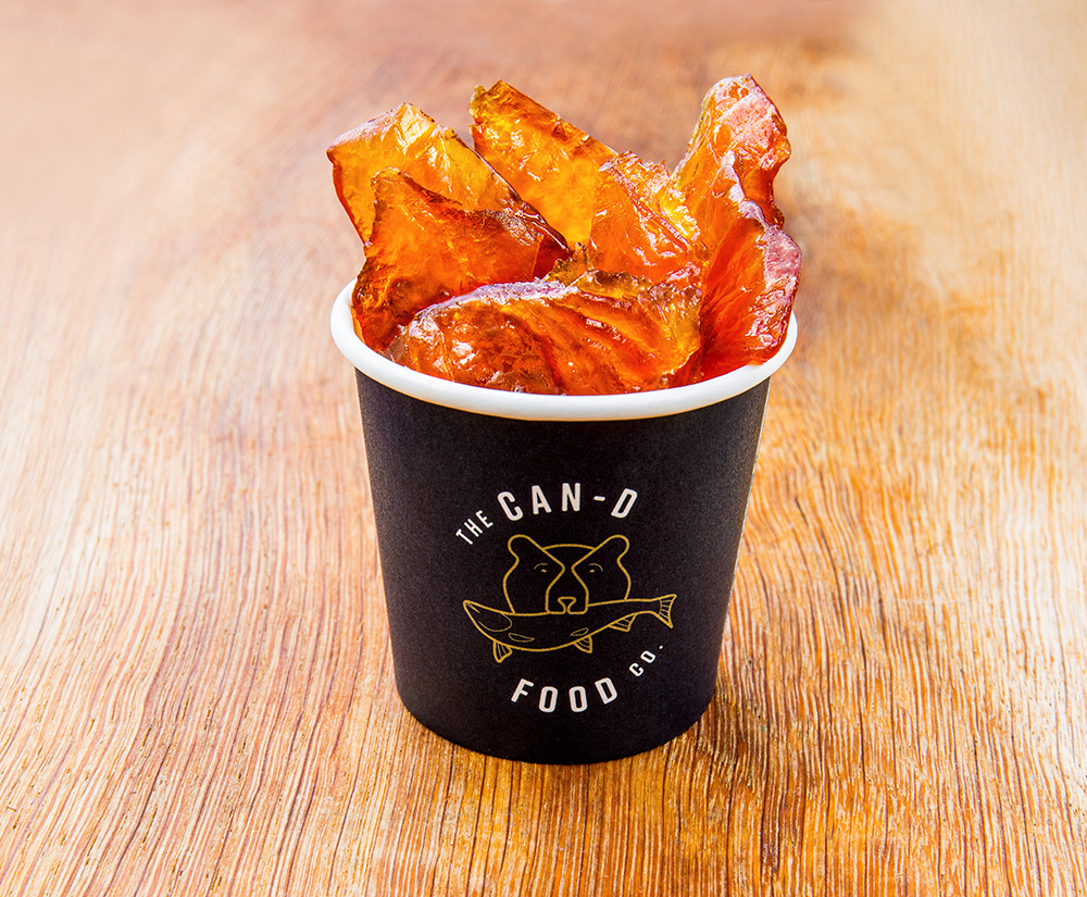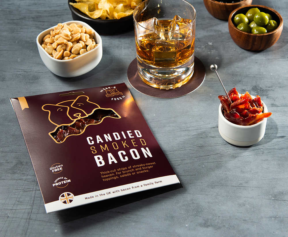 He wanted the branding to feel playful, yet also retain a high-end premium feel. Due to the product’s Canadian roots, we discussed incorporating a bear in some way (with its connection to salmon). To work, the bear would need to work in such as way that wouldn’t limit future product development, such as the Candied Smoked Bacon. The final work features a simplistic bear, with the product in its jaws. Using this as the focal point for the packaging lended itself nicely to the die-cut packaging, along with an opposing die-cut on the reverse to maximise light through the product (in the case of the salmon – another stipulation for the brief, so the product’s colour could be showcased).